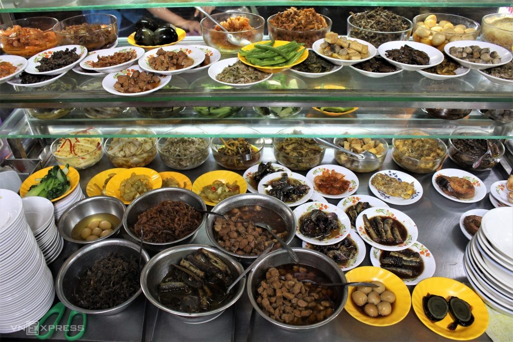 Due to a large number of side dishes, each is separated by color to determine their price. For example, yellow plates cost VND10,000 ($0.43), blue ones VND15,000 ($0.65), and red VND20,000 ($0.87).